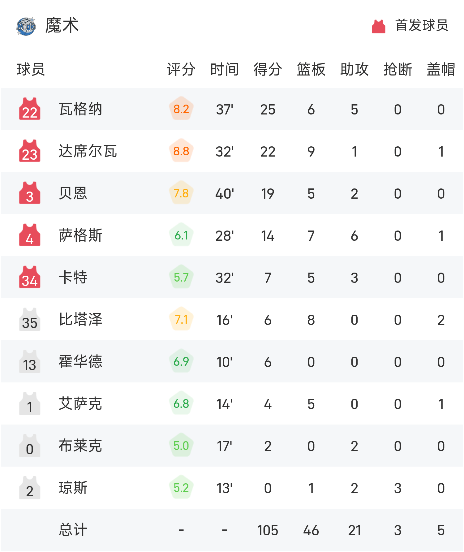 Wagner đã ghi được 25 điểm cao nhất trận, 6 rebound và 5 kiến tạo, đưa Magic đến chiến thắng.