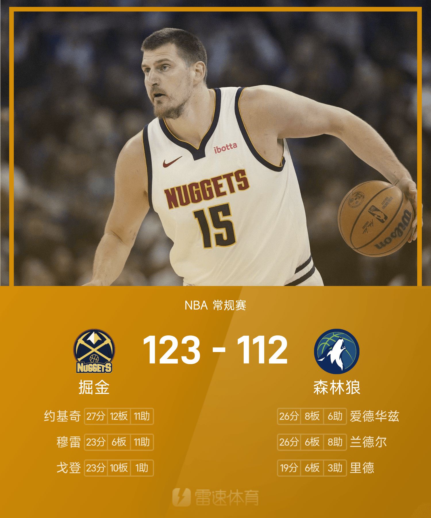 Báo cáo trận đấu NBA: Jokic có 27 điểm, 12 rebound và 11 kiến tạo, Nuggets đánh bại Timberwolves 123-112