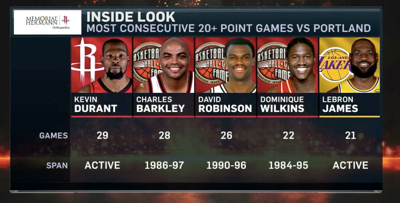 Durant thực hiện 8 trong số 12 cú sút trong hiệp và ghi được 20 điểm, ghi hơn 20 điểm vào lưới Trail Blazers trong 30 trận liên tiếp.