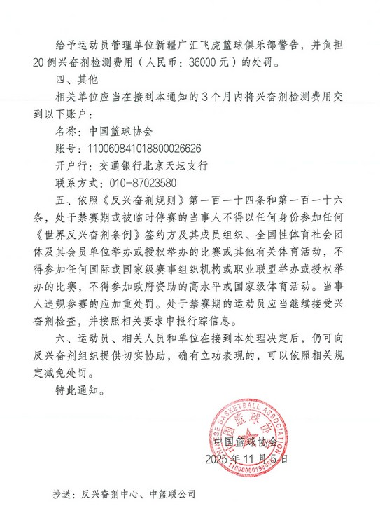 6686 Tin tức thể thao vào ngày 6 tháng 11 Hiệp hội bóng rổ Trung Quốc thông báo rằng mẫu A của cựu viện trợ nước ngoài bóng rổ nam Tân Cương Harrell đã có kết quả xét nghiệm dương tính với cannabidiol và anh ta đã từ bỏ việc kiểm tra mẫu B, đây là một hành vi vi phạm. Cuối cùng, lệnh đình chỉ 3 tháng được ban hành (từ ngày 5 tháng 11 năm 2025 đến ngày 4 tháng 2 năm 2026).