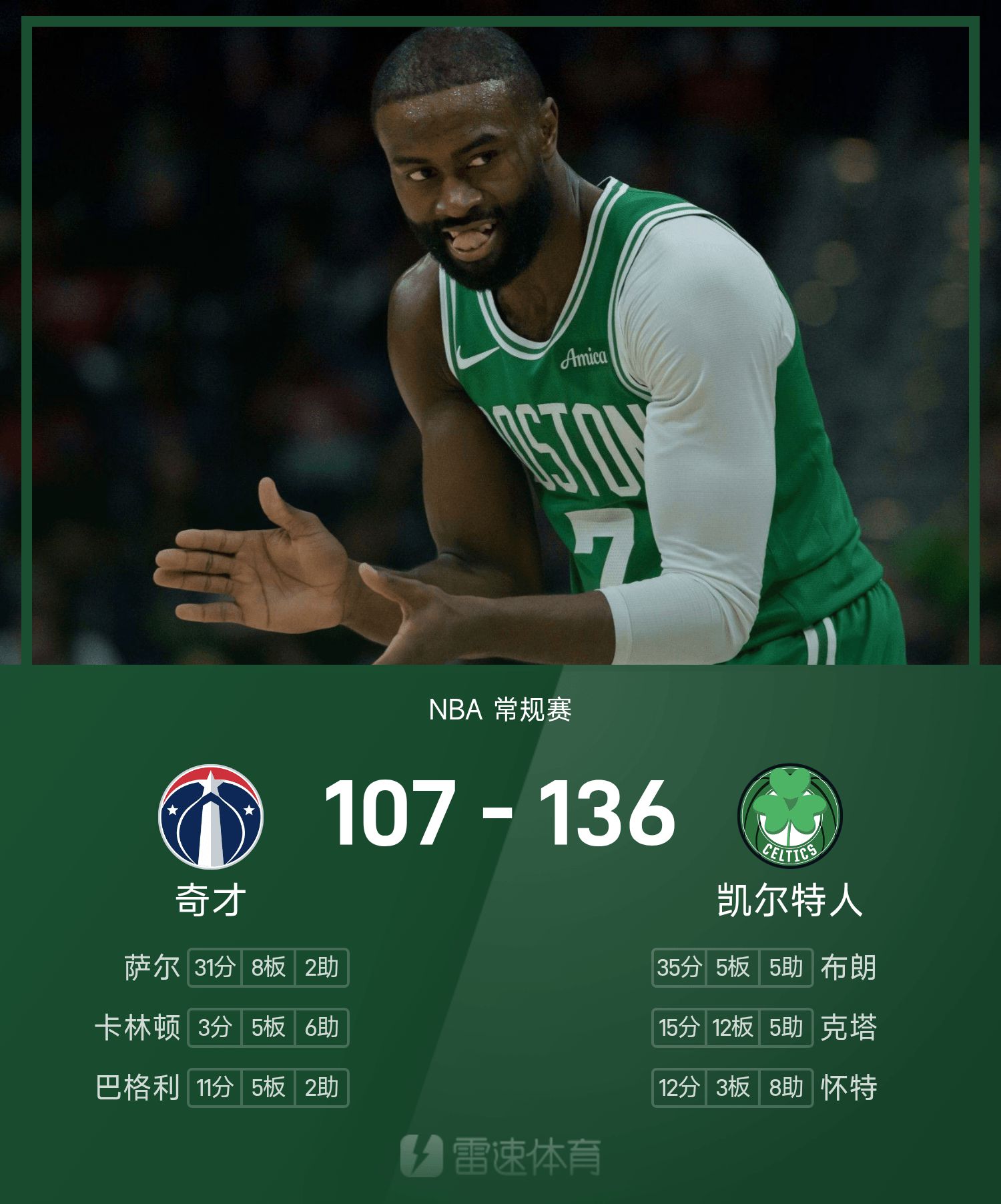 6686 Thể thao Tin tức ngày 06 tháng 11 Trong mùa giải NBA thường lệ 25/26, Celtics đối đầu với Wizards. Kết thúc trận đấu, Celtics đã đánh bại Wizards với tỷ số 136-107. Brown đã ghi được 35 điểm cao nhất trận, 5 rebound và 5 kiến tạo, đưa Celtics đến chiến thắng.