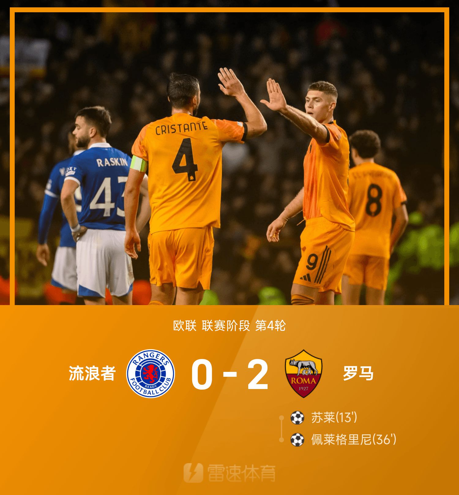 6686 Bản tin thể thao ngày 7/11 Ở vòng 4 Europa League 25/26, Roma đã đánh bại Rangers 2-0. Trong hiệp một, Sule và Pellegrini liên tiếp ghi bàn giúp Roma bảo toàn chiến thắng. Sang hiệp 2, Celik bỏ lỡ một cơ hội ghi bàn trống và hai đội không thể thay đổi tỷ số. Chung cuộc, đội khách Roma đã đánh bại Rangers với tỷ số 2-0.
