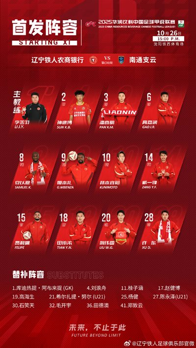 Đội hình xuất phát của Người sắt Liêu Ninh: 20-Liu Weiguo, 2-Sun Kangbo, 3-Pan Ximing, 6-Gao Jiarun, 8-An Yien, 9-Mbenza (F), 10-Bangben Yiyu (F), 14-Zang Yifeng, 15-Felipe (F), 18-Tian Yinong, 28-Xu Dong