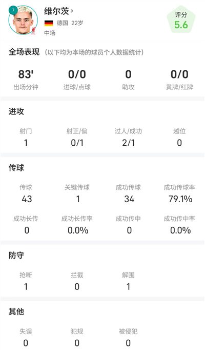 Số liệu thống kê cụ thể của Wirtz trong trận đấu như sau: