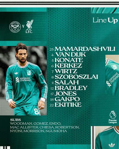 Đội hình xuất phát của Liverpool:25-Mamardashvili, 4-Van Dijk, 5-Konate, 6-Kyle Kez, 12-Bradley, 8-Szoboszlai, 17-Jones, 18-Gakpo, 7-Wiltz, 11-Salah, 22-Ekitic